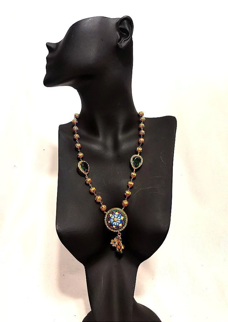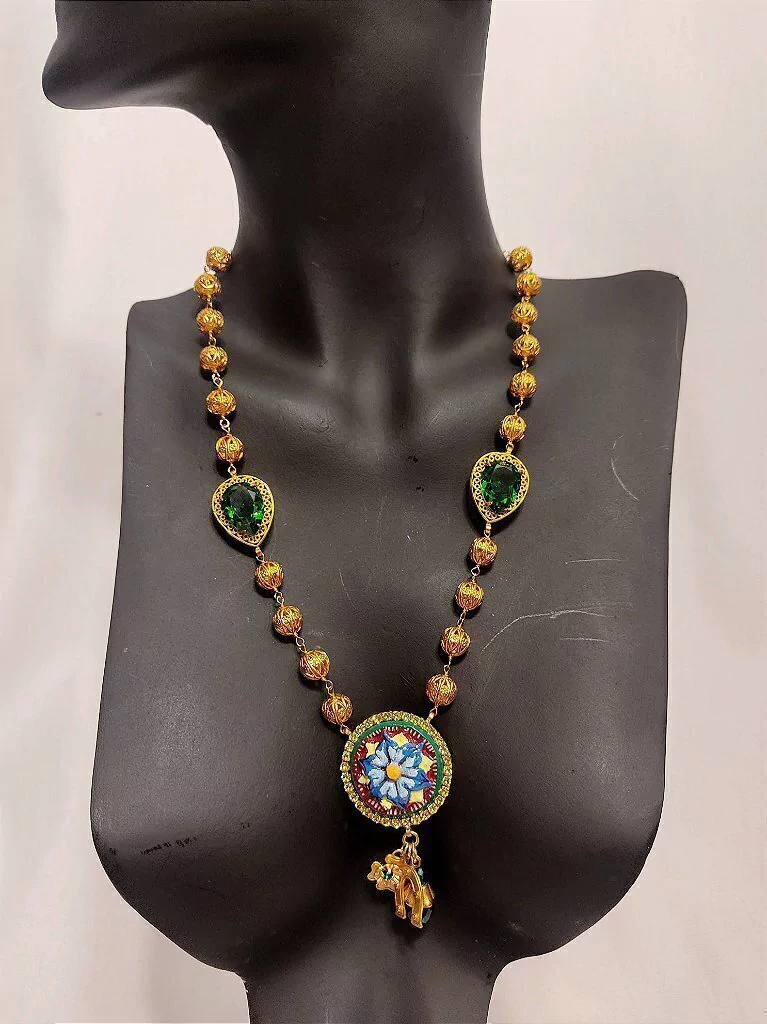Colar Dolce & Gabbana dourado com cristais verdes, pingente elegante mosaico Fiorentino.